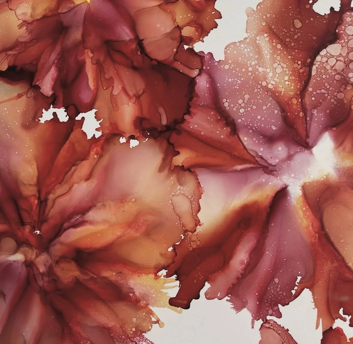 Manipulating inks using a straw, you will learn how to create fluid shapes of intricate layers resulting in a delicate, chiffon like quality.
